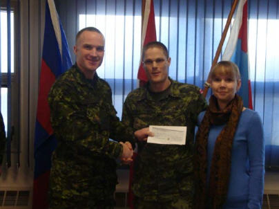 Photo 6: Christopher Fliesser, son of Maj (Ret’d) N. Fliesser (Ottawa), receiving the bursary cheque from LCol M. Gasparotto and his mother.