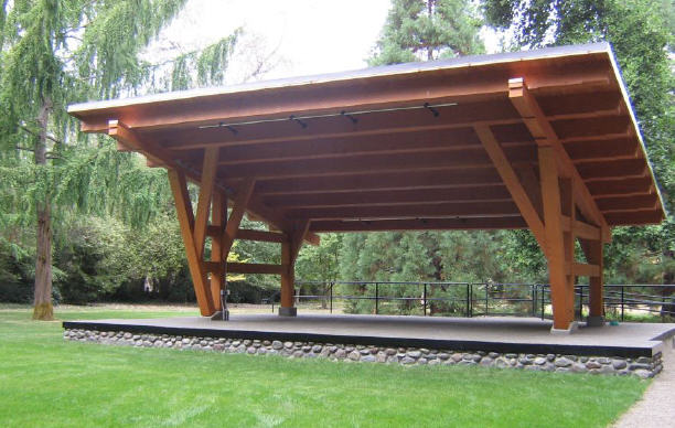 191 CEF just completed the construction of a new timber frame structure at Filberg Heritage Lodge & Park during the summer of 2014. They completion consisted in the demolition of the old concrete stage and electrical wiring. After ground preparation, the Flight prepared forms for pouring new concrete. The construction required distribution of new electrical service as well as relocation of the electrical panel. After the footing was completed , 191 CEF tackled the construction of main timber frame structure. Two members from the flight had to take a month course long to be ready for the construction. Timber framing or "post-and-beam" construction are methods of building with heavy timbers rather than dimensional lumber such as 2"x4"s. Essentially, timber frame structure are carefully fitted and joined timbers with joints secured by large wooden pegs. With the help of a crane, 191 CEF lifted the heavy timbers and raised the massive 27,000 pounds structure. The construction of a roof as well as the electrical and wiring were the last steps to reach completion of the new timber frame stage.