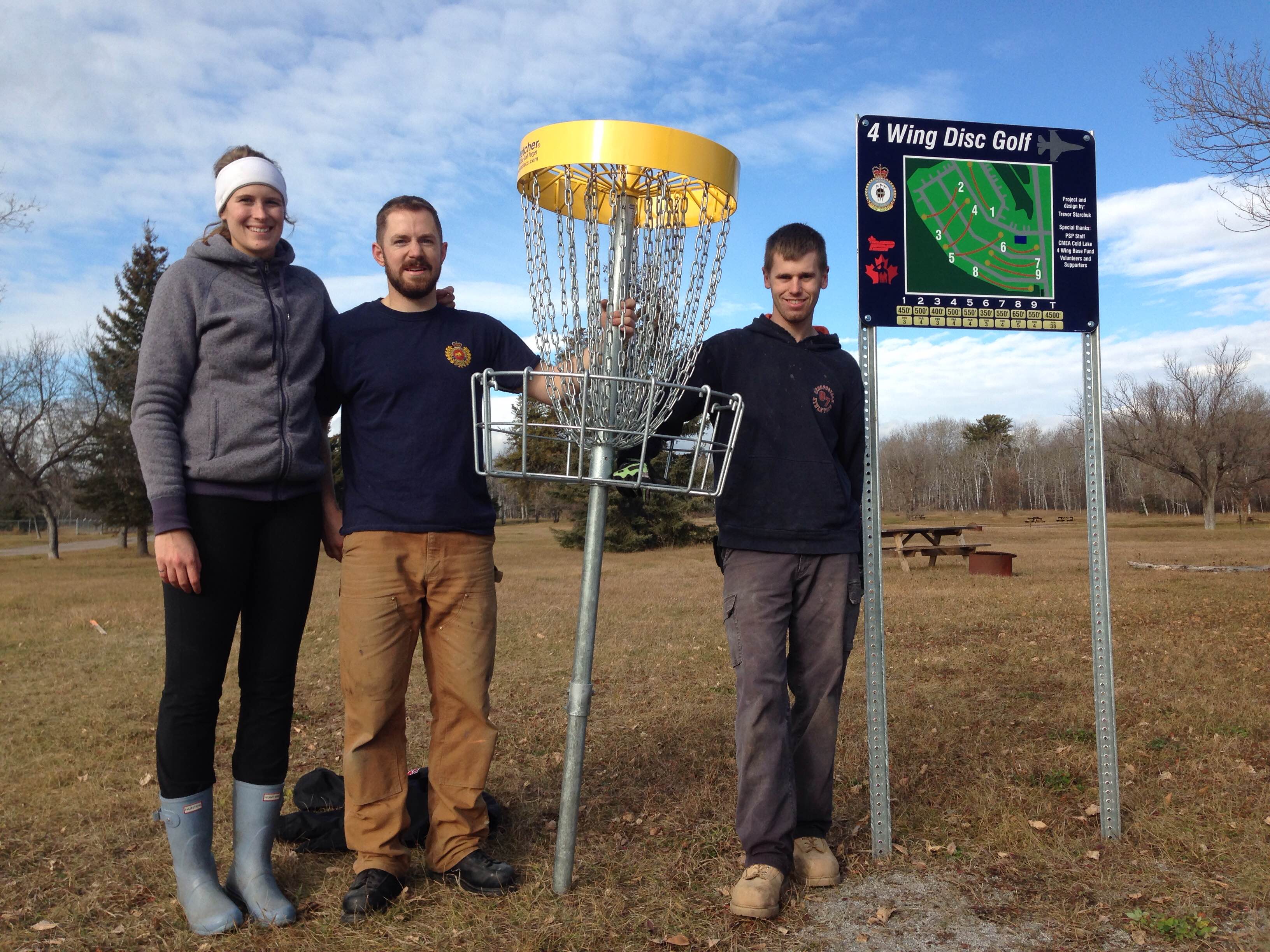 CMEA’s Cold Lake Chapter has just completed their annual community project. The project consisted of installing 9 Baskets for the Disc Golf Course at 4 Wing. In the first picture, CMEA Members, Lt Everitt & CWO Aubertin with Col Kenny, the 4 Wing Commander and some of the Disc Golf enthusiasts, are throwing the first Discs for the official openning of the Disc Golf Course. On the second picture, Lt Litjens, Lt Everitt and Chapter president Capt Walsworth are about to drill the first hole.