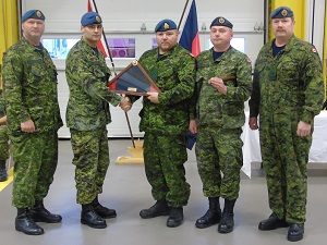 Ray is proud of his Engineer roots and even wore an Engineer hat badge on the inside of his air force beret. The beret and an Engineer flag were both lost in the fire. Through the CMEA Engineers in Need program, money was raised for Ray and his family with donations from CMEA Chapters in Chilliwack, Petawawa, Greenwood, and the national office. In addition to the financial support, the Greenwood Chapter recently presented Ray with a new Engineer flag and hat badge. The presentation included, right to left, MWO Bungay (Deputy Fire Chief), MWO Robar (14 Wing CE MWO), Cpl Ray Lambe, Major Button (14 Wing CEO), and MWO Knight (Deputy of Operations). "Once an Engineer, always an Engineer."