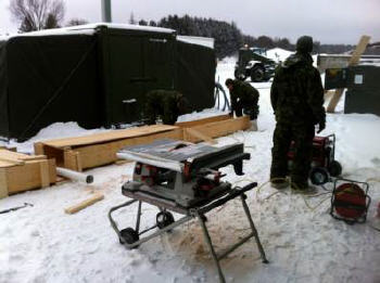 As part of 5 CER ex Sapeur Givré, under 5 CMBG ex Rafale Blanche, the construction troop of 5 Combat Engineer Regiment (5 CER) was deployed to build a camp to accommodate 275 people. Located in the municipality of Ste-Aurélie, the regimental camp was set up on the site of a sawmill belonging to François Giguère, who enthusiastically lent us his land. The construction troop, which formed part of 55 Sp Sqn, took advantage of this exercise to put its various construction trades to work, such as electricians, electrical generating system technicians, carpenters and plumbers.