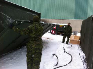 Once on site, the tp deployed very quickly. Electrical generating system techs installed and turned on two 150kW generators to power the camp. Meanwhile, electricians installed electrical panels and all the wiring needed for the camp’s power supply. With the help of carpenters, plumbers installed all of the pipes needed to provide the MECCs used for ablutions with drinking water straight from the site’s hydrant. Wastewater was released directly into the municipal sewer system. Carpenters built a box to be warmed by means of heaters, to keep pipes from freezing. Heated tents were also used to store drinking water.