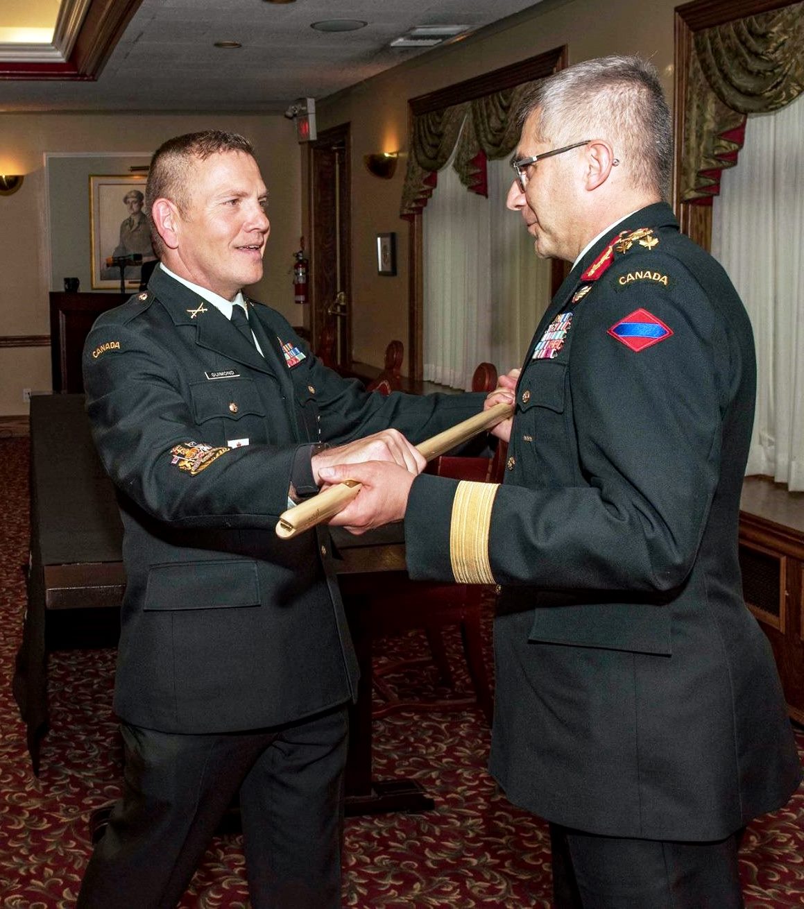 This morning, Chief Warrant Officer Alain Guimond officially handed over the position of Canadian Army Sergeant Major that he had held for the past three years to Chief Warrant Officer Stuart Hartnell of the Royal Canadian Regiment. The ceremony took place in the Officers' Mess in Ottawa, Ontario on June 7, 2018.