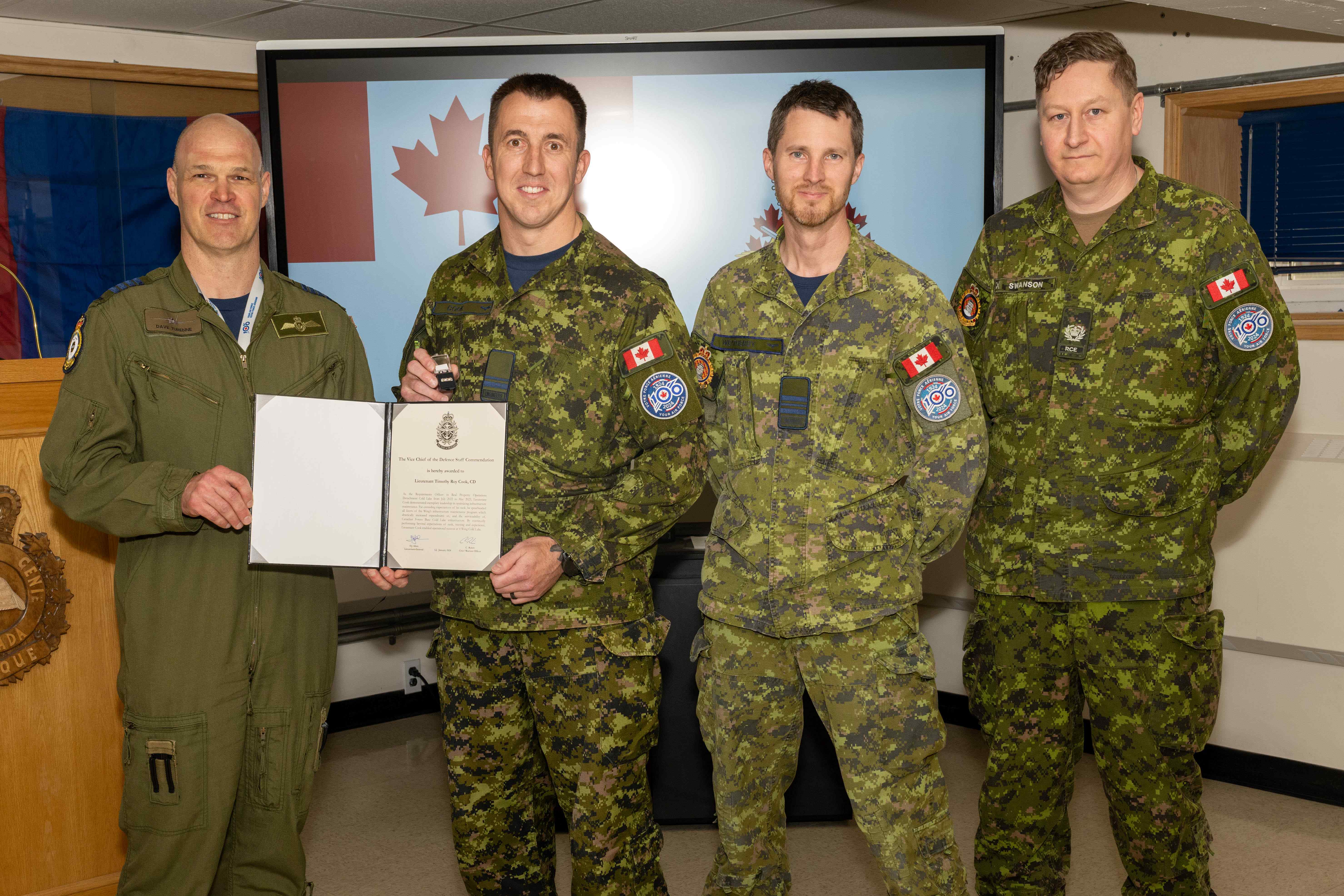 On May 08, Lt Timothy Cook, a Construction Engineering Officer in RPOU(W) Det Cold Lake, received his commission scroll and was also awarded the Vice Chief of Defence Staff Commendation. This is the second-highest command commendation that can be presented to a serving member.