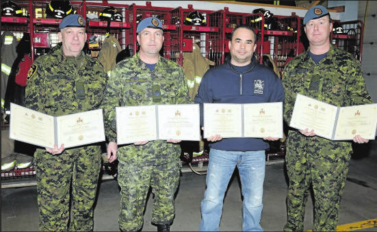 Photo (Left to Right) Corporal Wayne Fraser, Master Corporal Andy Matthews, Sergeant (Retired) Neil Cristo, and Corporal John Mac Dona Id. from 3 CDSB Ops Svcs Branch Fire Hall, hold their Commander's Commendations following the presentation by Colonel Stephen Lacroix, Commander 3rd Canadian Division Support Group (3 CDSG), and Chief Warrant Officer James Doppler, 3 CDSG Group Sergeant Major, at the Fire Hall on January 22, 2016.
