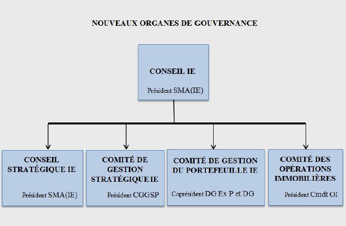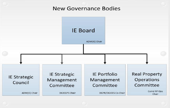 Pour y parvenir, il est nécessaire de mettre sur pied des comités appropriés, composés de membres appropriés et qui se pencheront sur des sujets appropriés. Tous les changements récents apportés à l’organisation du SMA(IE) (centralisation des biens immobiliers, réorganisation majeure, renouvellement de la Défense) nécessitent des changements à la structure de gouvernance.