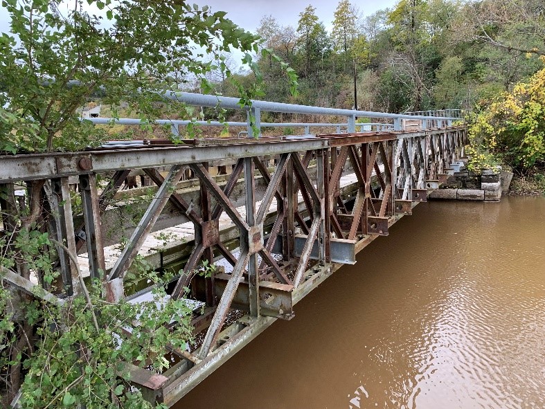 The Valley Inn Road Bailey bridge is named after the historic hotel at that location and opened in the 1820s when this road was the main connection between Burlington and Hamilton where Grindstone Creek connects to Hamilton Harbour. The original bridge closed about 100 years later in 1928 and a new single-span timber bridge was built on the same stone abutments.