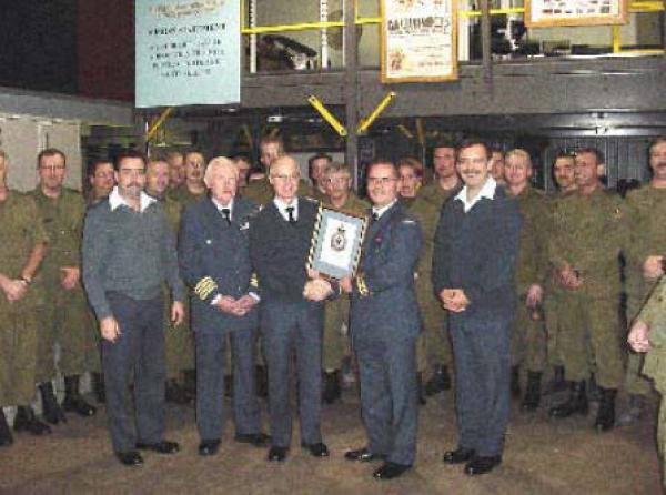 On 13 Nov 02 BGen PJ McCabe, A4, 1 CAD, visited 14 Airfield Engineering Squadron, Bridgewater, NS. Maj Carlos Marques, Commanding Officer of 14 AES presented BGen McCabe with a copy of the Squadron Badge. Shown here: L-R, CWO Gary Ryan, 14… more...