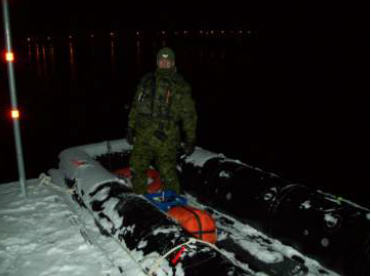 The scenario for the exercise was that a summit in the Mauricie region attended by numerous VIPs had prompted the Quebec Area Dom TF to deploy in aid of the civil power. A team of geomatics technicians deployed with the field squadron to provide mapping support. The exercise took us back to the basics of engineering, performing tasks such as presence patrols and assault boat crossings. The cold was a factor in preparing the boats and starting the motors, but good weather made for an easy crossing of the St Maurice River. The purpose of the 2.5-km journey was to insert a reconnaissance group and stealthily establish a cordon around an objective to enable the civil power to search a suspect building.