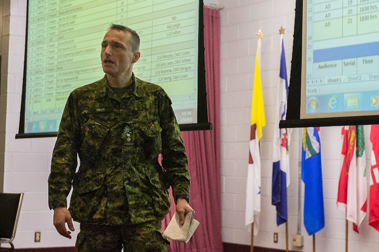 To start the first day of presentations, the Commandant of CFSME, LCol Honig, introduced guest speakers, and outlined the significance of Ex UBIQUE. The three mains points of importance for the exercise she identified were: the Officer and NCO relationship, the opportunity to interact with senior and high-ranking CME members, the discussion of current topics such as SSE (Strong, Secure, Engaged). The Colonel Commandant of the Canadian Military Engineers Branch, BGen Steve Irwin (Ret’d), was the first to speak to the newly graduating classes and brought forward discussion about values-based leadership in the CME. He emphasized the importance of our Canadian values in making great leaders in the CAF. He offered advice to the graduating students to motivate them to face all challenges and give their maximum effort through their careers, to proudly represent the Canadian Military Engineers. BGen Irwin (Ret’d) also spoke briefly about the history of some members of the CME and emphasized the importance of learning the history of the branch. Major-General Sirois (Chief Military Engineer) spoke about the unity of RCAF and CA engineers. Regardless of the colour of the uniform, engineers are working together towards common goals at the tactical, operational, and strategic levels. An example was given that in operational deployments, RCAF and CA engineers are expected to assume the role of the engineer regardless of colour of uniform. BGen Horgan, Chief of Staff VCDS, discussed the people aspect of SSE. He brought up the expectations of our future leadership in order to achieve the new missions of the defence policy. The CAF and CME are striving to make a more diversified working group that is more representative of today’s Canadian population.