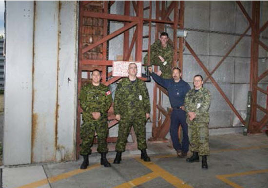 Real Property Unit (Pacific) were grateful to host at 19 Wing Refrigerant and Mechanic (RM) technicians On Job Training (OJT) on overhead hangar doors from 1 October to 4 November 2017. The hangar doors on the four Quick Reaction (QRA) hangars were in urgent need of maintenance before winter conditions arrive. These are the hangars where the CAF stages their fighters for quick reaction missions in support of NORAD. The state of the doors’ mechanical systems had deteriorated to the point that they were unreliable in an emergency situation, forcing that the doors were kept open when the hangar was in use. This type of maintenance for our RM Techs was an excellent training opportunity. In fact, the doors are identical to the Inuvik doors, so there was an additional operational effectiveness nexus to this skillset. Four different sets of four members from all across the Country rotated every week to maximise the numbers of Techs trained on overhead doors. With the supervision of RP Ops Det (Comox) RM shop, 19 CES RM Techs took the lead to ensure continuity between each set. All height doors are now fully operational both automatically and manually.