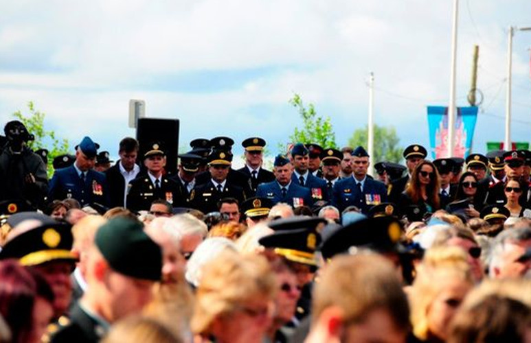 The focus of each year’s ceremony is the presentation of a black helmet (yellow for wildland firefighters) and a medal to the families of the fallen firefighters, i.e. those that have died in the line of duty or from a work-related illness.  The families are brought to Ottawa courtesy of the Canadian Fallen Firefighters Foundation.  The Head Dress Party is consists of firefighters from different fire departments from across Canada. WO Robert House, Chief Fire Inspector for Real Property Operations Central did the honours for the NDFS this year. There is a private period of reflection afforded the families before the ceremony at the memorial wall.  Throughout the weekend there are numerous social and commemorative events and the downtown core is teaming with firefighting shirts and uniforms.
