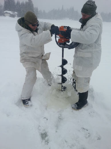 Members from 51e squadron of 5 CER are drilling a hole through the ice layer that formed over Lake Hayes in order to install water pumps.