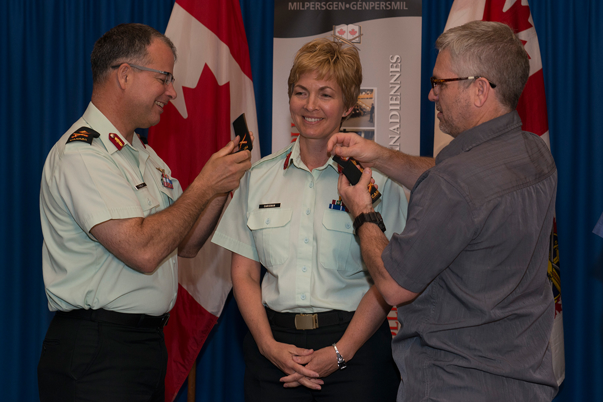 Brigadier-General Jennie Carignan became the highest-ranked woman in the Combat Arms yesterday, June 15, in a ceremony presided over by the Commander of the Canadian Defence Academy, Major-General Eric Tremblay.