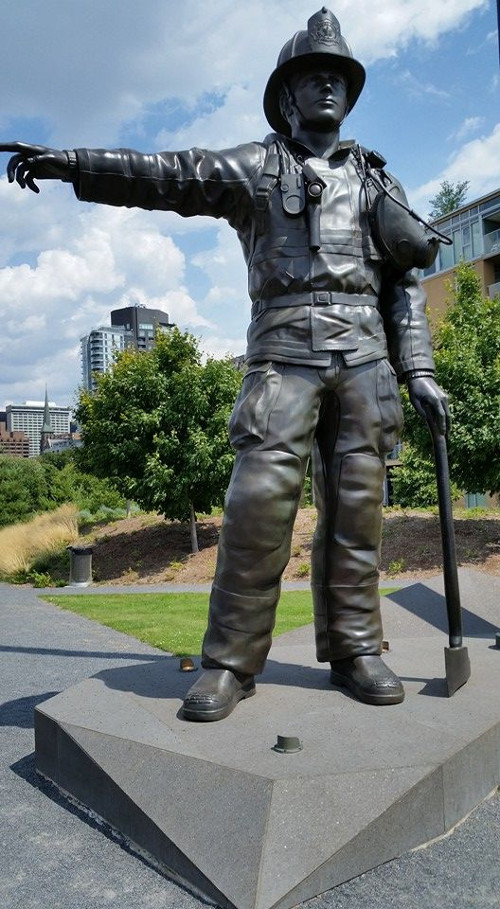The memorial site consists of an expansive 105’ granite wall etched with the names of those who have died in the line of duty since 1848. There are over 1,400 names etched on the wall. The site was completed for the 2012 ceremony. Previously the ceremony was held on Parliament Hill. In the centre of the site is an impressive bronze statue of a firefighter, solemnly pointing to the etched names on the memorial wall. Although situated adjacent to a busy parkway, the site is surprisingly serene and peaceful.