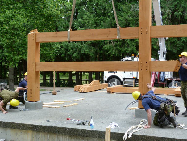 191 CEF just completed the construction of a new timber frame structure at Filberg Heritage Lodge & Park during the summer of 2014. They completion consisted in the demolition of the old concrete stage and electrical wiring. After ground preparation, the Flight prepared forms for pouring new concrete. The construction required distribution of new electrical service as well as relocation of the electrical panel. After the footing was completed , 191 CEF tackled the construction of main timber frame structure. Two members from the flight had to take a month course long to be ready for the construction. Timber framing or "post-and-beam" construction are methods of building with heavy timbers rather than dimensional lumber such as 2"x4"s. Essentially, timber frame structure are carefully fitted and joined timbers with joints secured by large wooden pegs. With the help of a crane, 191 CEF lifted the heavy timbers and raised the massive 27,000 pounds structure. The construction of a roof as well as the electrical and wiring were the last steps to reach completion of the new timber frame stage.