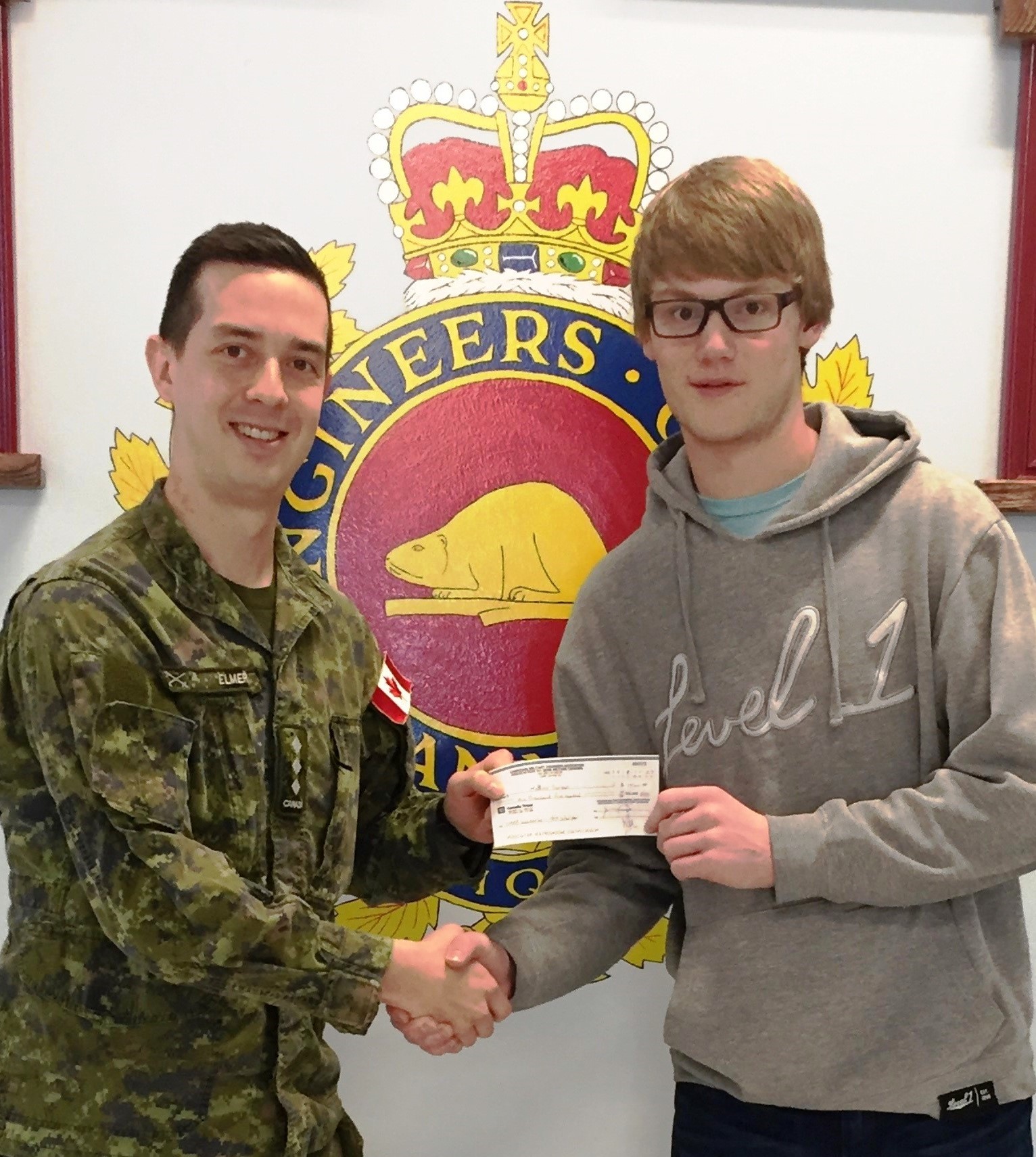 - Capt Kevin Elmer from RP Ops Unit West Wainwright presents a bursary cheque to CMEA member WO Raymond Gendron(Ret'd) on behalf of his son Antoine Gendron who was unable to be present.