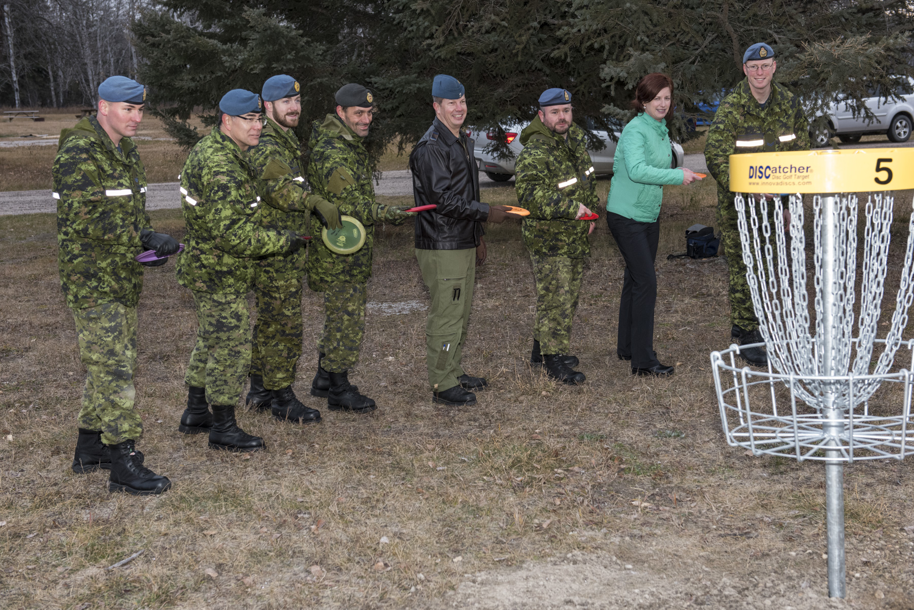CMEA’s Cold Lake Chapter has just completed their annual community project. The project consisted of installing 9 Baskets for the Disc Golf Course at 4 Wing. In the first picture, CMEA Members, Lt Everitt & CWO Aubertin with Col Kenny, the 4 Wing Commander and some of the Disc Golf enthusiasts, are throwing the first Discs for the official openning of the Disc Golf Course. On the second picture, Lt Litjens, Lt Everitt and Chapter president Capt Walsworth are about to drill the first hole.