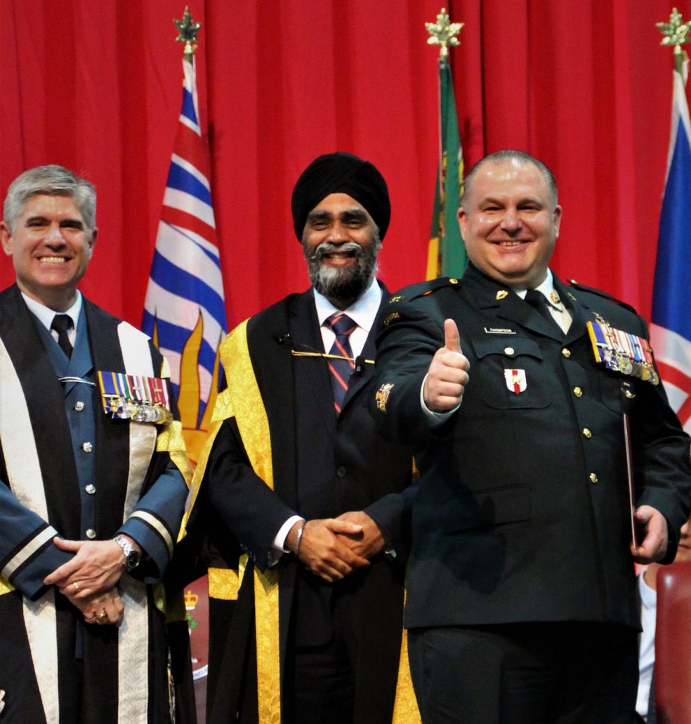 Pictured here with the Minister of National Defence, Harjit Singh Sajjan, and the Commandant of the Royal Military College, Brigadier-General Sean Friday, is Chief Warrant Officer Mike Thompson displaying his newly granted degree.  CWO Thompson completed his degree under Non-Commissioned Members Professional Development (NCMPD) programme and is assigned the letter 'E" to precede his college number.