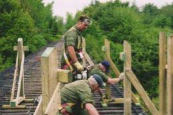 On 17 June members of 143 AEF Lunenburg County, Nova Scotia, under the leadership of MWO Clayton, arrived at the Martins River Railway Bridge to start the task of decking the bridge for safe pedestrian use. The Martins River Bridge is located in Lunenburg County NS between the towns of Mahone Bay and Chester. It is part of Phase II of the Trans-Canada Trail and was included in the CME2003 Bridges For Canada Program for renovations. The abandoned railway trestle/double span bridge crosses a gap of 77 M over Martins River. The Dynamite Trail Association with support from the NS Department of Natural resources and the NS Trails Association sponsored the project. The plan was to complete the project during the 17-21 June timeframe with the posts and side panels being pre-fabricated at the 143 AEF building, outside of Bridgewater, the previous week.