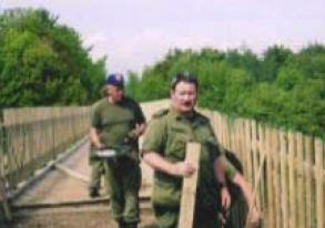 The bridge crew of ten individuals left the unit at 0730 17 June with three trucks full of materials and equipment for the bridge site located 22 Km away. Captain Gary Silliker, OC 143 AEF, went to the job-site at 1300 that day to see how the project was proceeding. After viewing the progress he was heard to paraphrase a military commander from the Crimean War when he remarked, "143, damn all that eagerness - slow down, you have 5 days to complete this job!" The reason that OC 143 AEF felt like that CO of yore was brought on by the rapid progress that had been made that morning. The small, but very eager, crew had installed 75% of the posts, 50 % of the side panels and 30 % of the decking - they were well ahead of schedule!