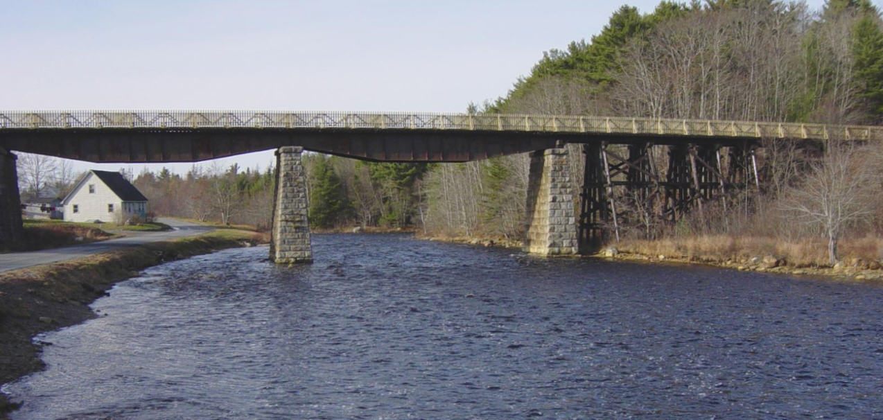 • Built about 1905 by the Halifax & South Western Railway, a subsidiary of the Canadian Northern Railway controlled by the legendary Mackenzie and Mann. The last train crossed this bridge on 18 September 1991. It was a long, heavy train, powered by six CNR diesel-electric locomotives.