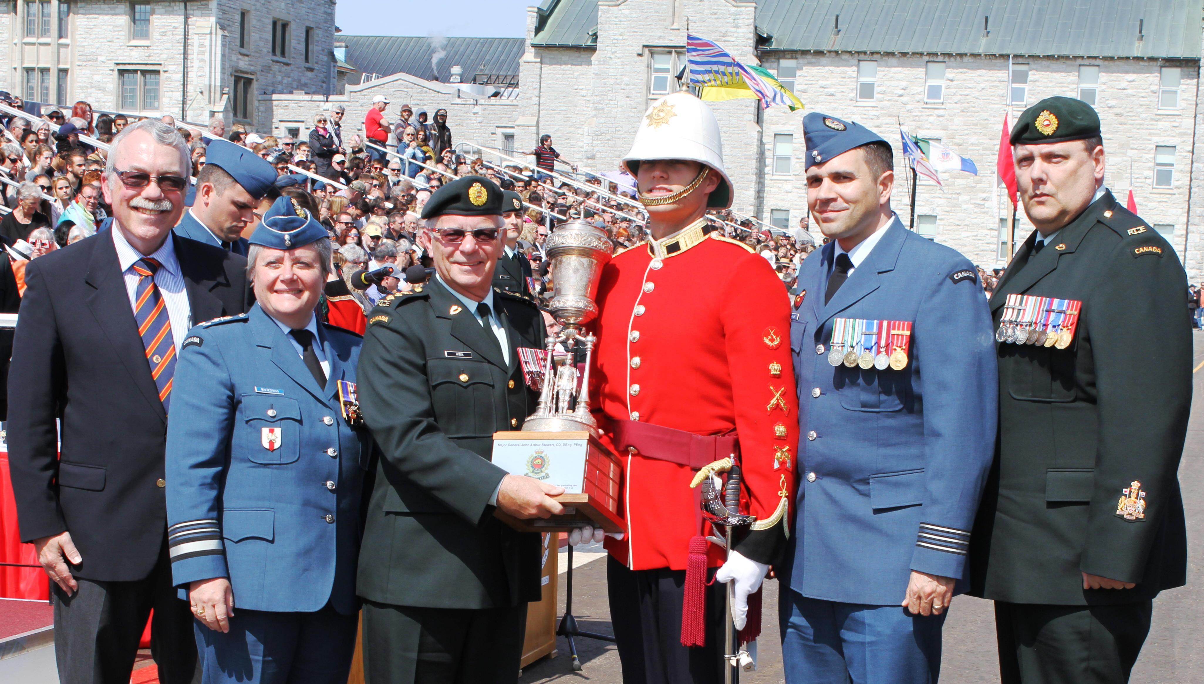 It was a beautiful, sunny day on Friday, 20 May 2016 as many senior engineers were on hand at the Royal Military College of Canada (RMCC) Commissioning Parade to present the prestigious Major-General John Arthur Stewart Trophy. This trophy is awarded to the top military engineer cadet in his or her graduating year whose occupation classification is Engineer (MOC 24 / MOSID 00181) or Construction Engineer (MOC 46 / MOSID 00189).  It is sponsored by the Canadian Military Engineer Association (CMEA), and is based on high standards of proficiency in each of the four components of the Royal Military College of Canada; academic studies, athletic capability, military performance and bilingualism.  This year the trophy was presented to 26420 OCdt William Antoine Carle.