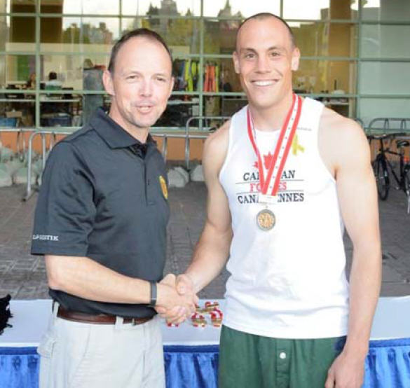 Captain Craig Fettes (right) with the Canadian Armed Forces Running Patron, Brigadier‐General Alain Pelletier. The CAF Running Nationals brings together many elite athletes for its 5‐kilometre, 10‐ kilometre, halfand full‐marathon events. The 5‐kilometre event was hotly contested this year, with two CAF members finishing within six seconds of Craig’s time as they sprinted for the line. Craig’s first place finish in the 5‐ kilometre event was the result of many hours of hard work with training beginning in February. He ran the race in 16:03 minutes and finished second place overall out of a total of over 8,000 participants.