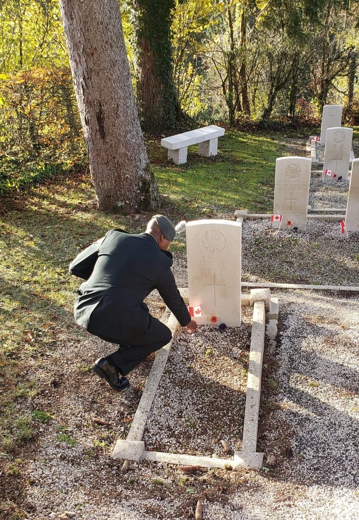 Photo 2: Laying a poppy on one of 29 Canadian graves in the Supt Cemetery.