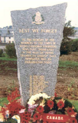 A memorial was erected in 1977 at Newhaven, England, in honour of members of the Corps of Royal Canadian Engineers who lost their lives as a result of the Dieppe Raid of 19 August 1942. It was erected and financed by the efforts of a group lead by the 11th Field Company RCE WWII veterans based in Sarnia, ON. They chose Newhaven as the location for their memorial because they embarked for Dieppe from Newhaven and because so many of the wounded were put ashore at Newhaven following the Raid.