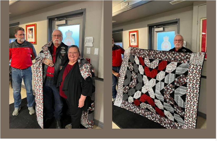On March 1st, at the Legion in Lancaster, Ontario, Dan Larouche presented Sergeant (ret’d) Gaëtan Lefebvre, with his Quilt of Valour. Gaëtan served for 22 years, in the Canadian Army, as a Combat Engineer. A marking event in his career, was to be deployed from CFB Val Cartier, in response to the 1970 October crisis in Québec, (FLQ). His wife of 54 years, Murielle was on hand to wrap the quilt around his shoulders.