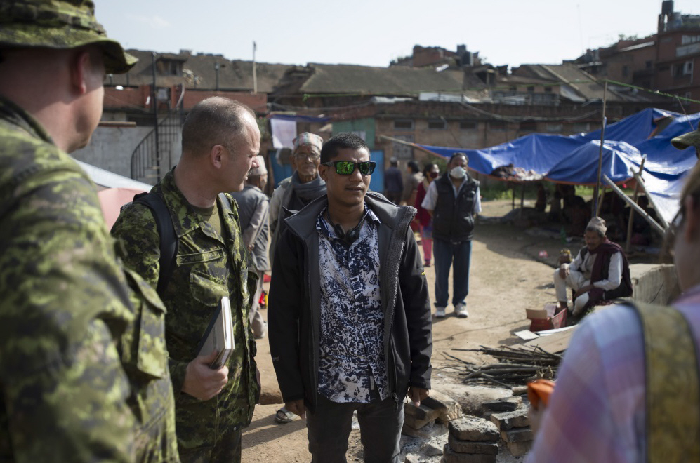 Photo Credit: Warrant Officer Steve Winstanley speaks with a local volunteer inside a camp for Internally Displaced Persons during a reconnaissance patrol by elements of the DART in Bhaktapur, Nepal on May 1, 2015. Photo: Captain Gabriel Rousseau, Canadian Forces Combat Camera.