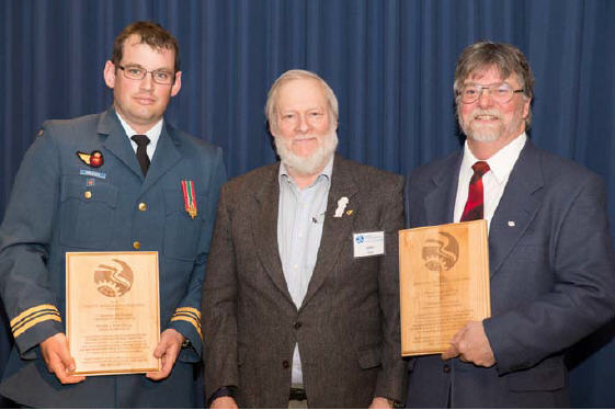 L’ARC remporte un prix d’ingénierie soulignant l’excellence en environnement Article de nouvelles / Le 29 mai 2014 Par David Elias Le major Chris Greaves (à gauche) et M. Ronald Kent (à droite), de Stantec Architecture Ltd., reçoivent un prix d’excellence en environnement de M. John Clark, de la Northwest Territories and Nunavut Association of Professional Engineers and Geoscientists (NAPEG), le 15 mai 2014. Le prix vise à récompenser une solution novatrice pour le traitement des eaux usées dans le milieu exigeant que constitue la Station des Forces canadiennes Alert située au Nunavut. Le major Greaves, officier du génie construction de la base dans la Force opérationnelle interarmées (Nord), à Yellowknife (Territoires du Nord Ouest ), a accepté le prix au nom de la 1re Division aérienne du Canada.