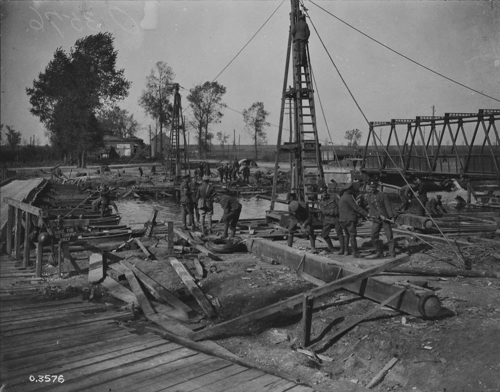 Currie’s plan has audacious and other Allied generals thought it would fail. However, Currie was confident his four divisions, 40,000 men, would be victorious. Basically, infantry would cross through a narrow gap in a dry portion. Once across, Engineers recently reorganized from field companies into battalions and described as easily the best in the entire British Expeditionary Force, to throw 17 bridges across the canal to allow artillery, armour and supplies to cross.  The Engineers were deployed rapidly – sometimes undetected, but often under machine gun fire. They built vital bridges and pontoons for artillery troops and floating footbridges for other troops over water-filled portions of the canal. In the end, Currie’s plan succeeded, Canal du Nord was breached and the road to Cambrai was open.